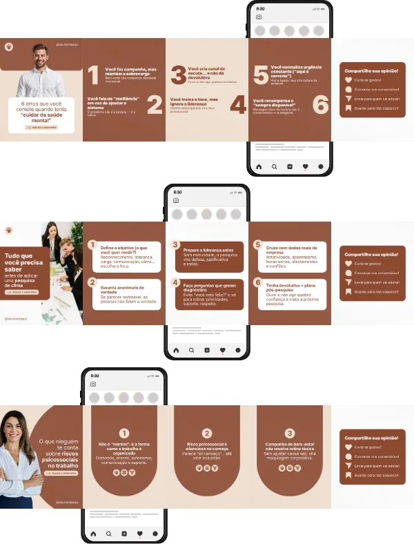 Posts desenhados, com conteúdos prontos e um design refinado. Valorize e destaque seu perfil, tornando-o mais profissional e cativante.